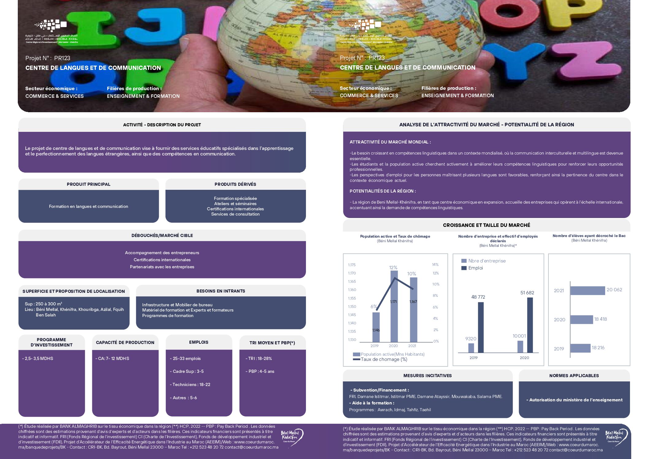Le projet de centre de langues et de communication vise à fournir des services éducatifs spécialisés dans l’apprentissage et le perfectionnement des langues étrangères, ainsi que des compétences en communication.