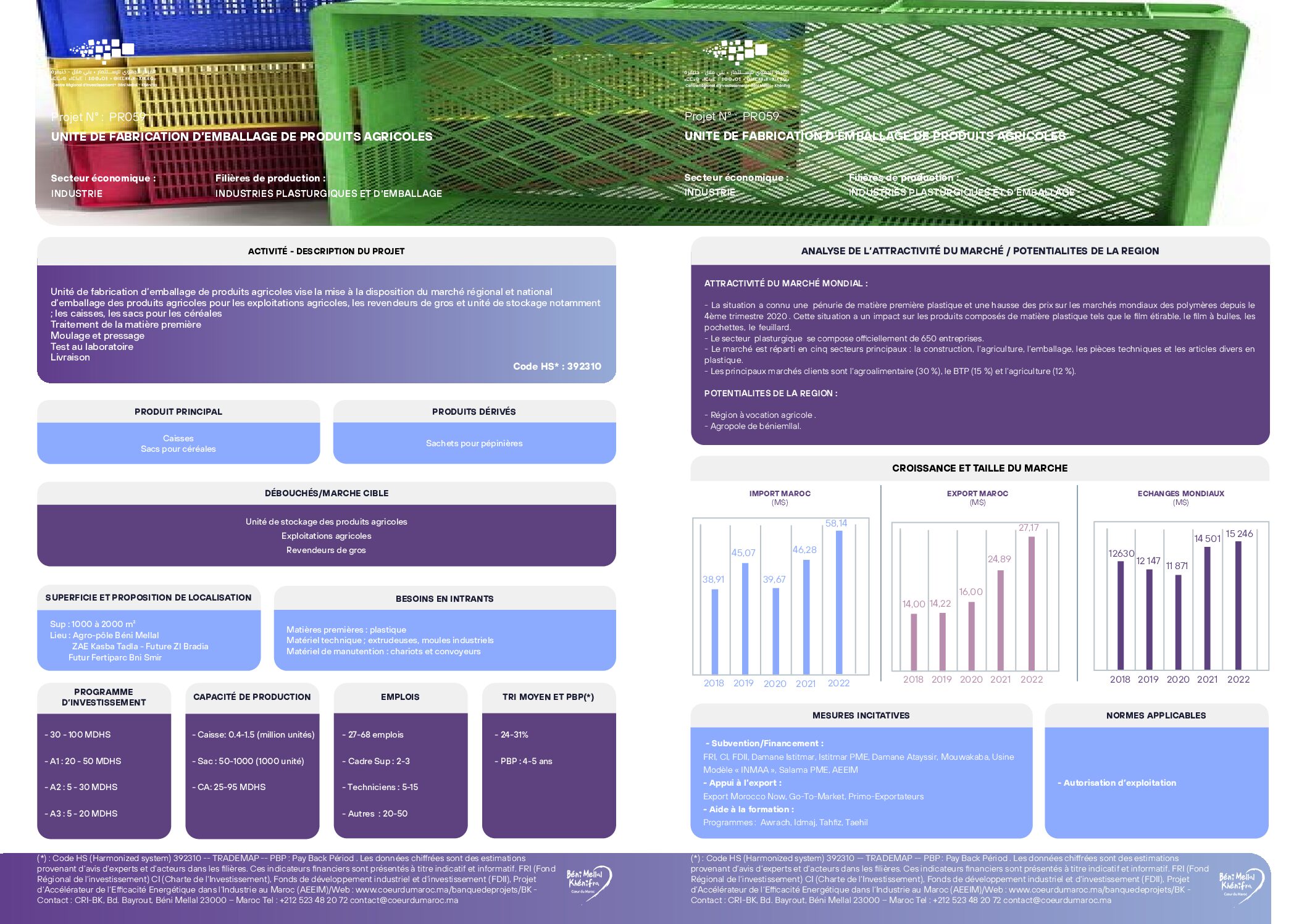 L’unité de fabrication d’emballage de produits agricoles vise la mise à la disposition du marché régional et national d’emballage des produits agricoles pour les exploitations agricoles, les revendeurs de gros et unité de stockage notamment ; les caisses, les sacs pour les céréales