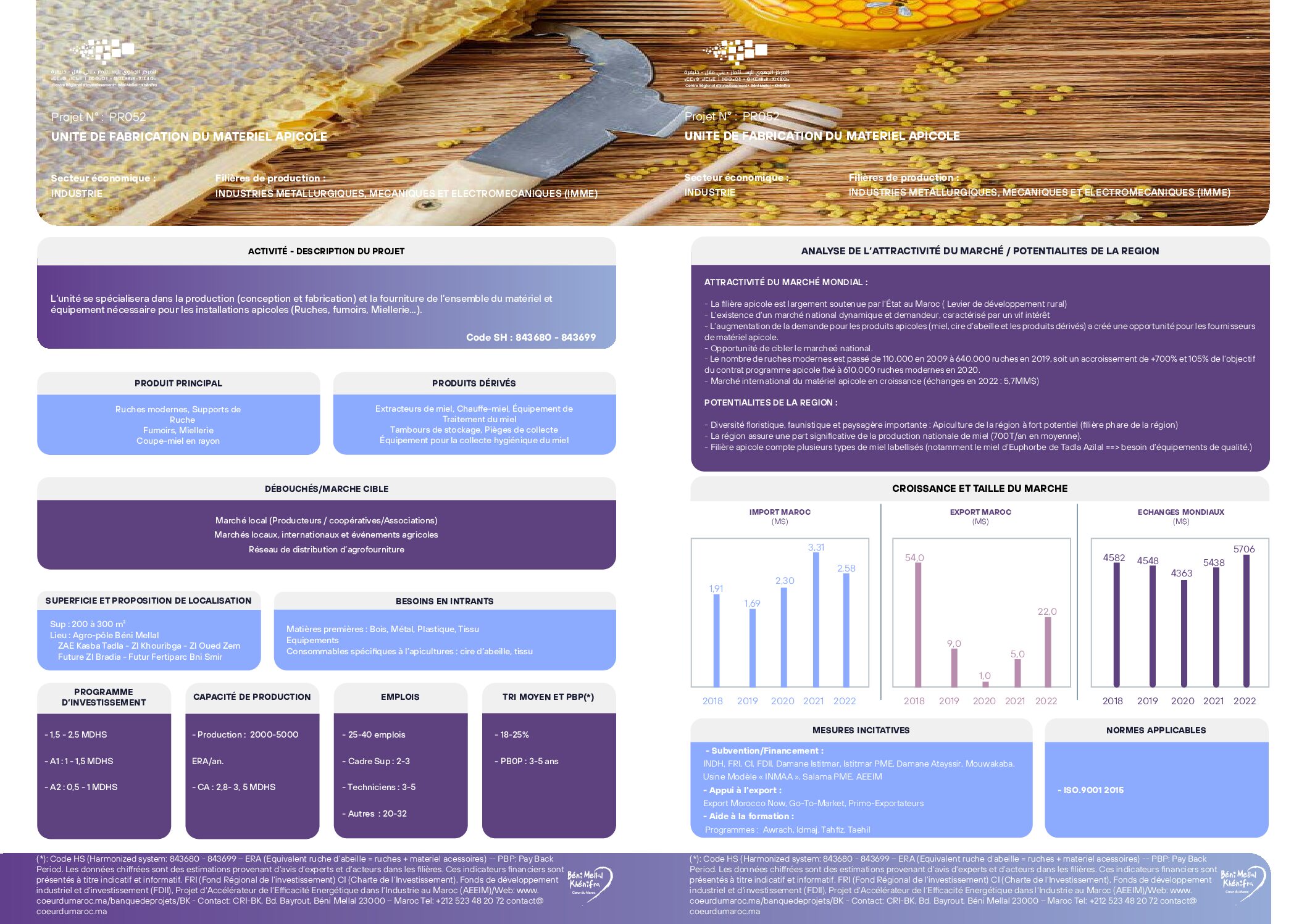L’unité se spécialisera dans la production (conception et fabrication) et la fourniture de l’ensemble du matériel et équipement nécessaire pour les installations apicoles (Ruches, fumoirs, Miellerie…).